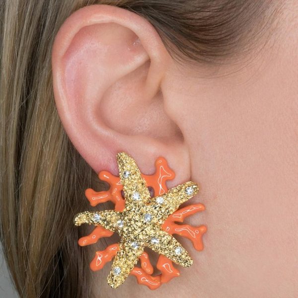 Product Description: These sea stylish earrings will have you dreaming of beaches and sand. A gold and crystal statement starfish is surrounded by coral enamel branches.