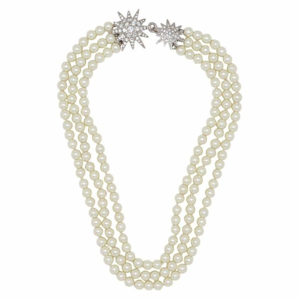 Product Description: You’ll be seeing stars with this modern take on the pearl necklace. Completed with a dazzling rhodium and rhinestone starburst clasp.