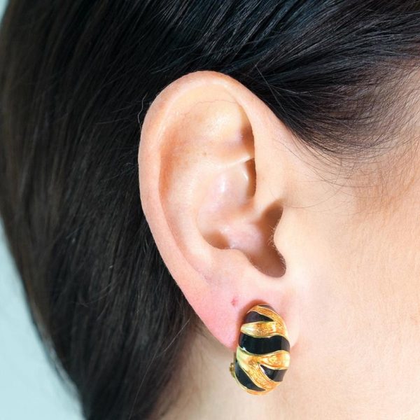 Product Description: Unleash your bold, wild side with these eye-catching half hoop earrings. Featuring striking black and tan enamel tiger stripe detailing, these statement clip-ons deliver fierce style without compromising comfort. Perfect for adding a touch of exotic elegance to any outfit.