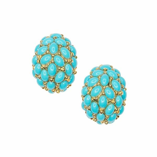 Product Description: Complete any outfit with these high-class gold hoop earrings covered in turquoisecabochons.