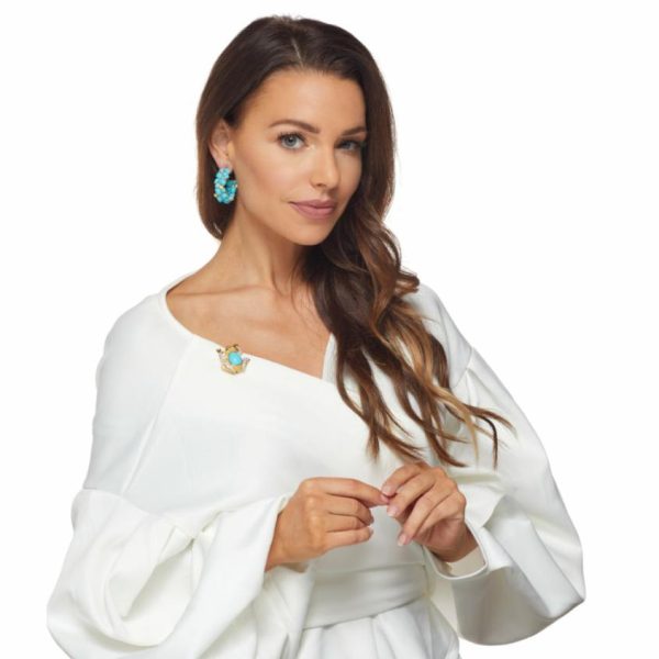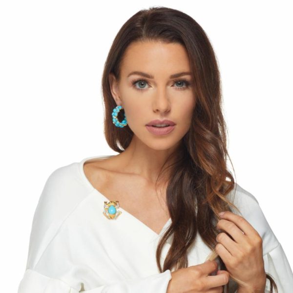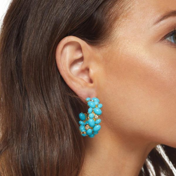 Product Description: These vibrant polished gold featuring crystal and turquoise accents pierced hoop earrings are must needed in your collection.