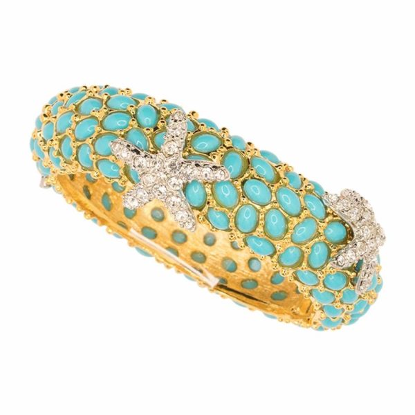 Product Description: Capture coastal elegance with this exquisite crystal pave and turquoise starfish bangle. Perfect for standalone statement wear or beautifully layered with other bracelets for a curated look.