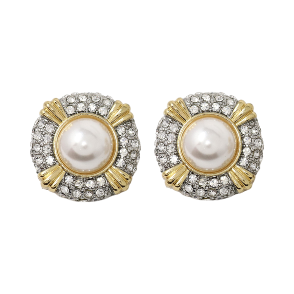 Product Description: Whatever the occasion, these two-tone (silver and gold-plated) crystal button clip earrings will shine bright with a beautiful, faux white pearl center.
