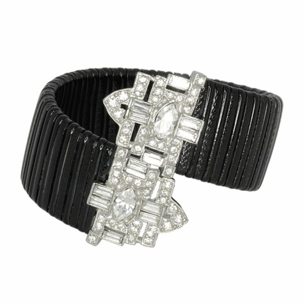 Product Description: Make a sophisticated statement with this striking black rhodium and crystal adorned stretch deco cuff that effortlessly elevates any ensemble.