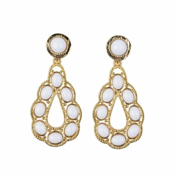 Product Description: These delightful gold base earring with white cabochons in teardrop shape enhance any look.
