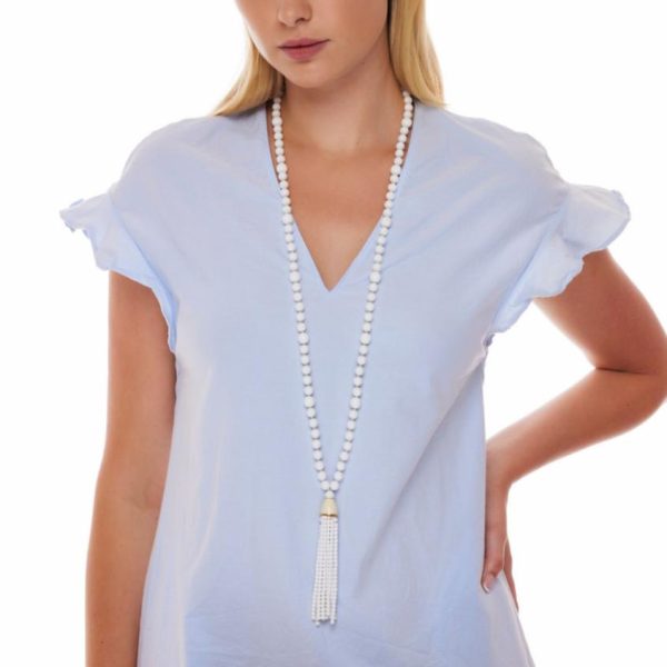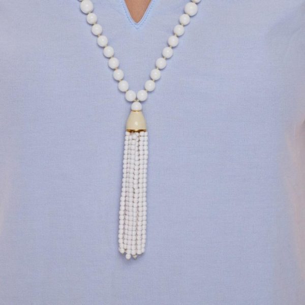Product Description: Add some flair to your collection with this classy white glass bead tassel necklace.
