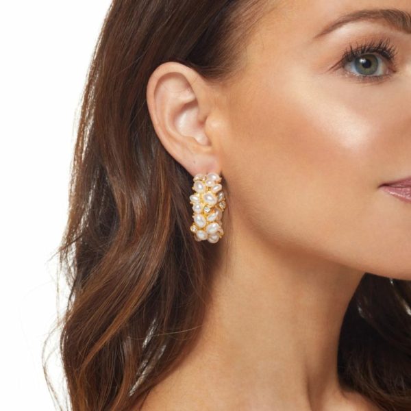 Polished Gold/ Crystal White Pearl Cabochons Hoop Clip Earring Features: