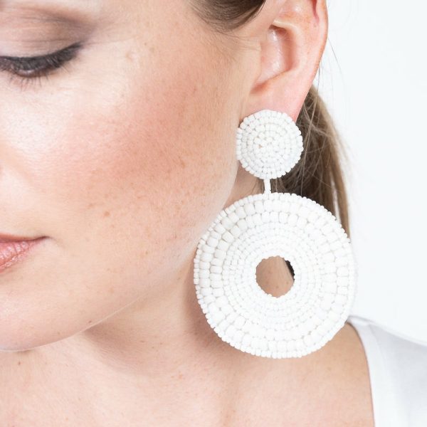 Product Description: White circular seedbead designs make these drop earrings a sophisticated and dramatic way to complete any look.
