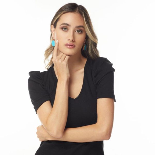 Product Description: Gold-plated with a comfortable euro-wire pierced backing, these turquoise enamel “kidney” shaped drop earrings deliver a vibrant pop of color that elevates any outfit with effortless sophistication.